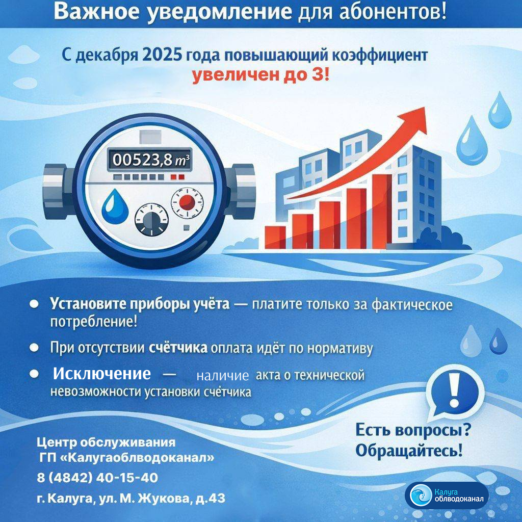 В соответствии с ранее действующими положениями при отсутствии приборов учета размер платы за услуги холодного водоснабжения рассчитывался с применением повышающего коэффициента 1,5. Для стимулирования установки приборов учета и усиления ответственности собственников квартир за отсутствие приборов учета холодной воды и их несвоевременную поверку с декабря 2025 года этот коэффициент увеличен до 3 (трех).