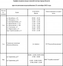 - 25 сентября с 9:00 до 21:00 в связи с проведением ремонтных работ будет прекращена подача холодного водоснабжения по адресам:...